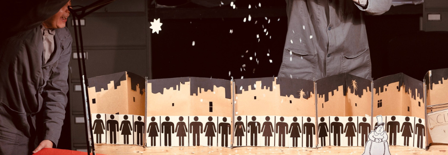 Zwei Puppenspieler bauen eine ganze Welt aus Papier. Die Inszenierung enthält Konfetti und Nebel.