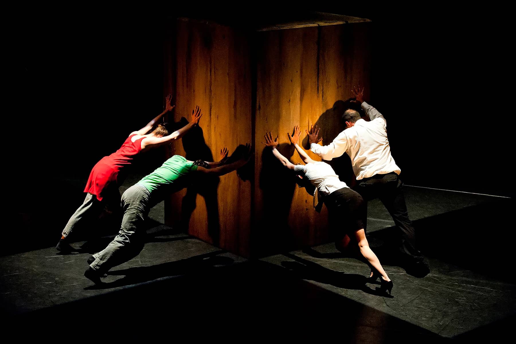 A huge wooden cube on stage. Two dancers and two musicians try to climb over the obstacle. The first thing they do is to jostle and push each other around! The main thing is to be first to reach the top. But what happens when you reach your goal? "Bounce!" tells of struggles, ambition and setbacks on the way to success.