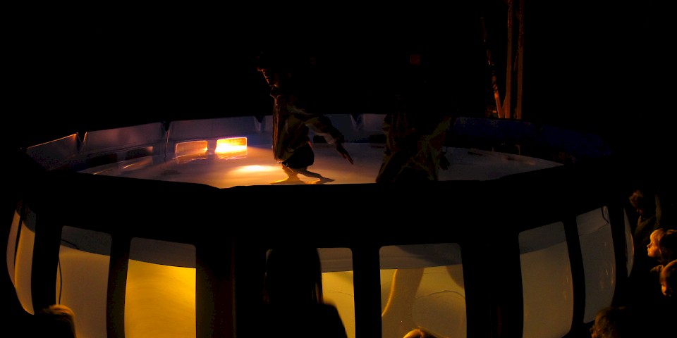 In einem großen transparenten Schwimmbecken simulieren zwei Tänzer das Leben eines Babys im Bauch der Mutter. Die zuschauenden Kinder schauen durch kleine Fenster von außen in diese Unterwasserwelt und erfahren etwas über den Urzustand, in dem sich alle Menschen vor ihrer Geburt befinden. In einer Atmosphäre aus Licht und Klängen, Bildern und Bewegung verschwimmen die Grenzen zwischen innen und außen. Erinnerungen an Geborgenheit werden wach. Zurück bleibt die Erfahrung des Ganzen. Entstanden im tänzerischen Spiel mit der Schwerkraft und mit den Dingen.
