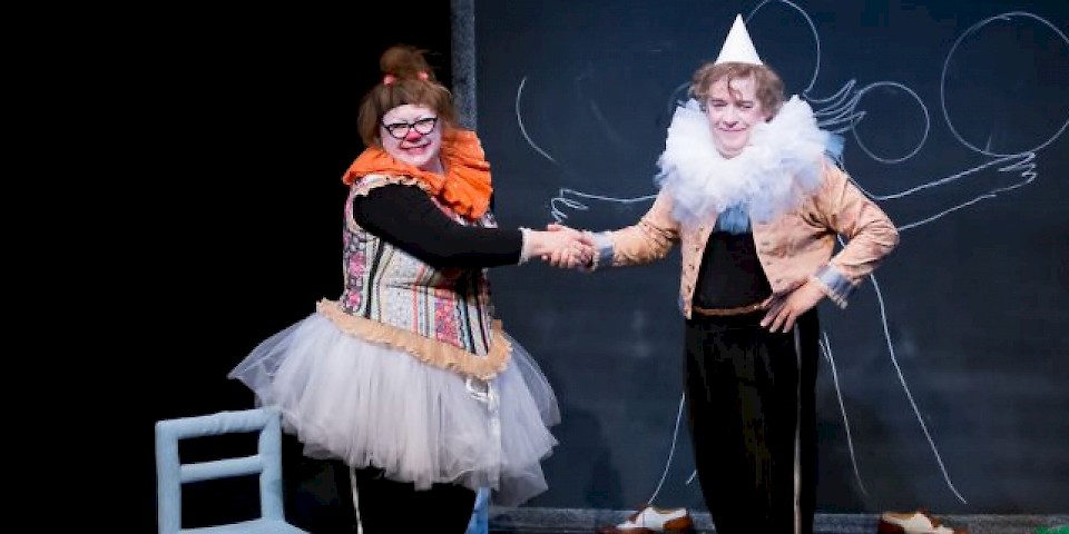 Es ist die „blaue Stunde“ im Wald. Die Geräusche der Nacht verschwinden, plötzlich ist es still, dann kommen die Töne des Tages. Ein Mädchen und ein Junge, zwei komische Vögel, werden wach und erinnern sich daran, dass sie gestern – oder war es vorgestern – ihren richtigen Platz in der Welt immer noch nicht gefunden haben – also Schuhe an und die Reise beginnt … Zwei Schauspieler und ein Musiker öffnen mit ihren kleinen Geschichten einen zauberhaften Theater-Kosmos, der Raum schafft für eigene Assoziationen. Eine Welt voller Widersprüche und Gemeinsamkeiten: hell und dunkel, leise und laut, groß und klein, verträumt und ruppig, traurig und witzig, einsam und gemeinsam. Das Publikum wird mitgenommen auf eine spielerisch-poetische Entdeckungsreise zweier Theater-Clowns in die Welt der Stühle. Ihr fantasievolles Spiel erzählt von der Wirkung des Zufalls, von Verzagtheit und Mut, und letztendlich vom feinen Bündnis zwischen AkteurInnen und ZuschauerInnen.