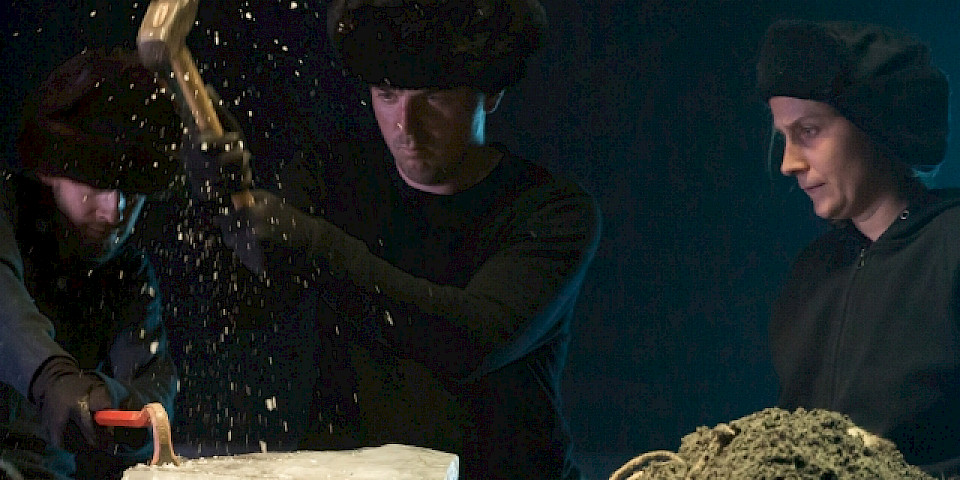 Drei Arbeiter einer Sandgewinnungsanlage aus dem hohen Norden bringen ihre Maschinen und Werkzeuge mit, um eine Welt aus Eis und schwarzem Sand zu errichten. Im virtuosen Figurenspiel der drei kommt ihr Großvater Nanook als kleine Figur aus dem Eis und erzählt von seiner Begegnung mit Kimik, dem Bärenkönig. Inspiriert von der Kultur und Sagenwelt der Inuit erzählt „Blizzard“ von der Suche nach dem Gleichgewicht zwischen Natur, Tieren und Menschen.