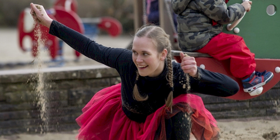 Ein gewöhnlicher Spielplatz wird zum Ort für ein außergewöhnliches Tanzabenteuer. Zwei Tänzerinnen bringen Tanz und Bewegung in das Spiel der Kinder. Sie reagieren auf ihr Publikum und die Umgebung. In der Bewegung entstehen Beziehungen zwischen dem Ort und den Menschen. Die Kinder sind eingeladen, diese Kunsterfahrung selbst mitzugestalten. Alle Kinder auf dem Spielplatz können mitmachen, wenn sie möchten.