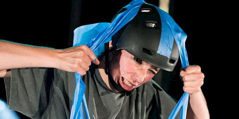 Was mit farbigen Klebebändern alles machbar ist! Verknüllen, zerreißen, festkleben und sich wieder lösen. All das und viel mehr passiert auf der runden weißen Bühne, auch die eigenen Körper der Performerinnen werden zur Klebefläche und bekommen witzige neue Akzente. Mit kleinen und großen Besen bauen sie immer neue Räume und verhandeln gemeinsam mit dem Publikum spielerisch auch die Grenzen vom Einzelnen zum anderen und zu seiner Umgebung.