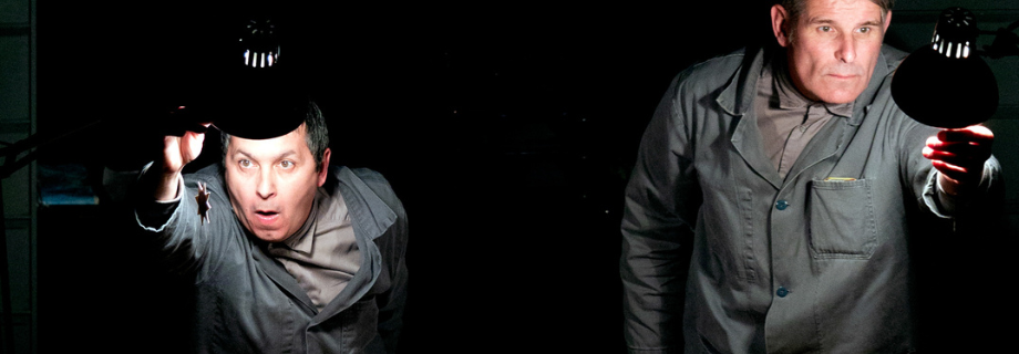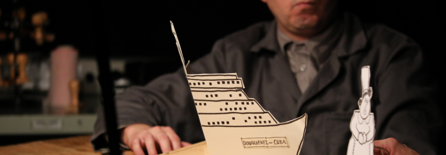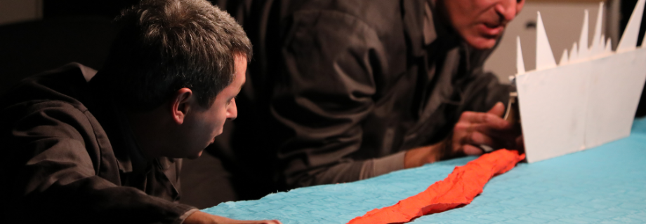 Zwei Puppenspieler bauen eine ganze Welt aus Papier. Die Inszenierung enthält Konfetti und Nebel.