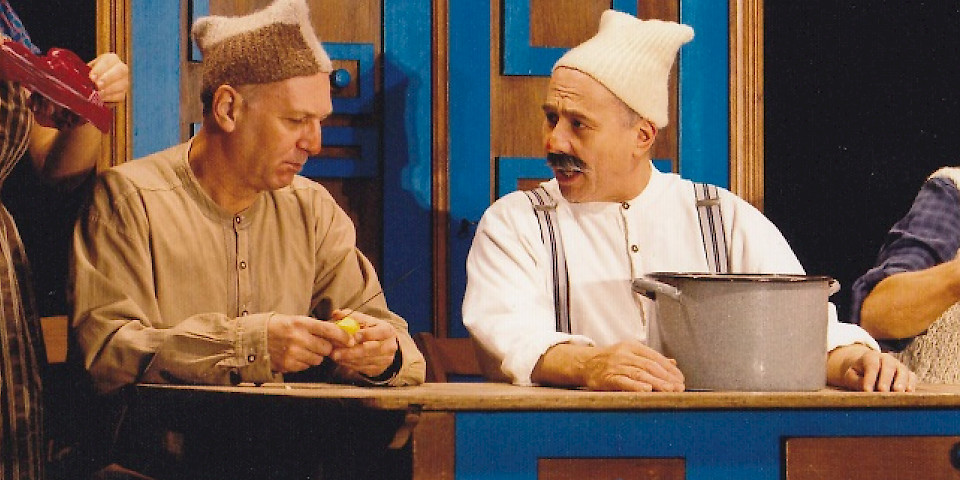 Mit drei Holzpferden, einem Topf Kartoffeln und einem russischen Akkordeonspieler, der auch Klaus heißt, erzählt das TheaterGrueneSosse eine richtige Geschichte von früher, in der die Großmütter noch böse waren und die Menschen gierig und gemein.